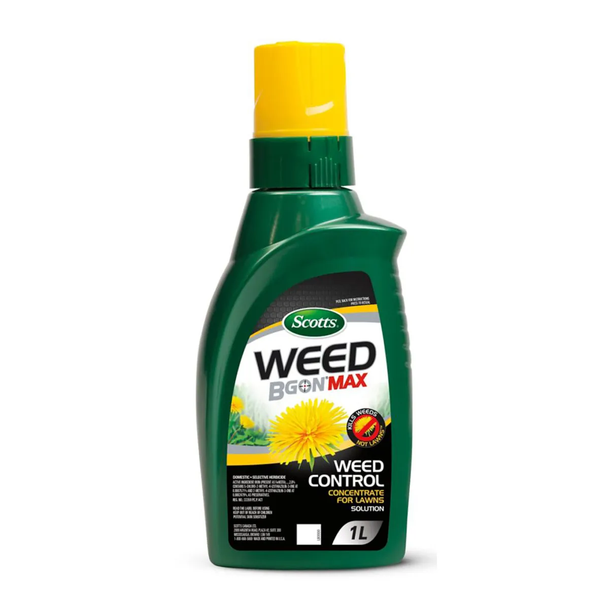Keep ugly; nasty weeds; like dandelion and white clover; from ruining the look of your lawn with Scotts® Weed B Gon® MAX weed control concentrate for lawns. It is formulated with chelated iron; so it kills weed ; not lawns. That means you won’t have to spend all your free time hand-pulling weeds. Apply with any handheld or backpack sprayer; watch it start to work within several hours of application. Take that; you awful weeds!.