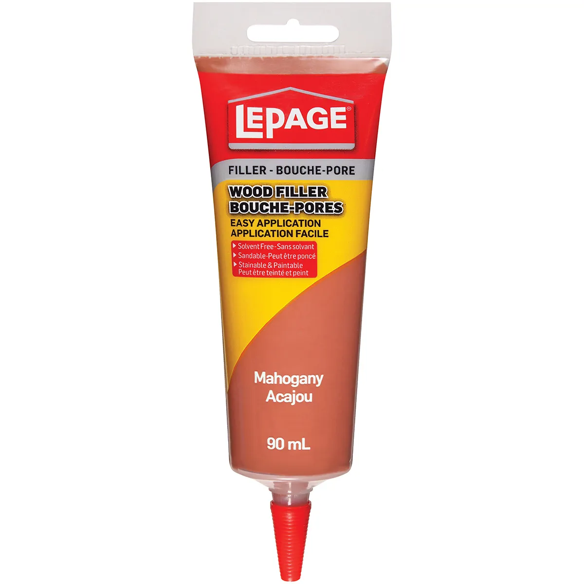 LePage tinted wood filler; 90 ml; squeeze tube packing; 0.1 percent VOC; 1200 mcP viscosity; 7.7 pH; fine smooth paste; mahogany; 4 hr drying time; mild acrylic odor/scent.
